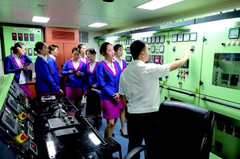 船舶驾驶、轮机工程、邮轮乘务三个专业的学员按照专业分为三组,轮流进入船舶驾驶台、船舶机舱和船员生活舱室,参观了解船舶仪器设备和船员生活情况。在驾驶台,驾驶员介绍了航海仪器仪表的配备和功能、航行和锚泊值班的工作要求;在机舱,轮机员介绍了船舶主机和发电机的功能参数、集控室仪表,以及与驾驶台沟通协作等情况;在生活区,船长带领“准船员”们参观了船员房间、娱乐休闲设施、餐厅和厨房。