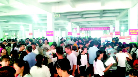 本报6月27日讯(记者 贺莹莹 刘潇) 6月27日上午,由齐鲁晚报主办的山东高考招生咨询会宁津一中专场,在3000余名考生与众多家长的期待下,火爆开场,8点活动刚开始,不少招生展位就被围得水泄不通,很多高校准备的材料不到半个小时就发放完毕。