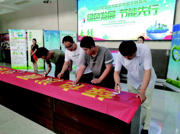 近日,在中国人民银行菏泽市中心支行一楼大厅内,该部门正组织全体员工开展“绿色发展,节能先行”的签字活动,活动主要倡议职工减少一次性用品的消耗,在办公区域减少使用空调、照明,并在当天将电梯停开一天,鼓励职工乘坐公共交通工具。