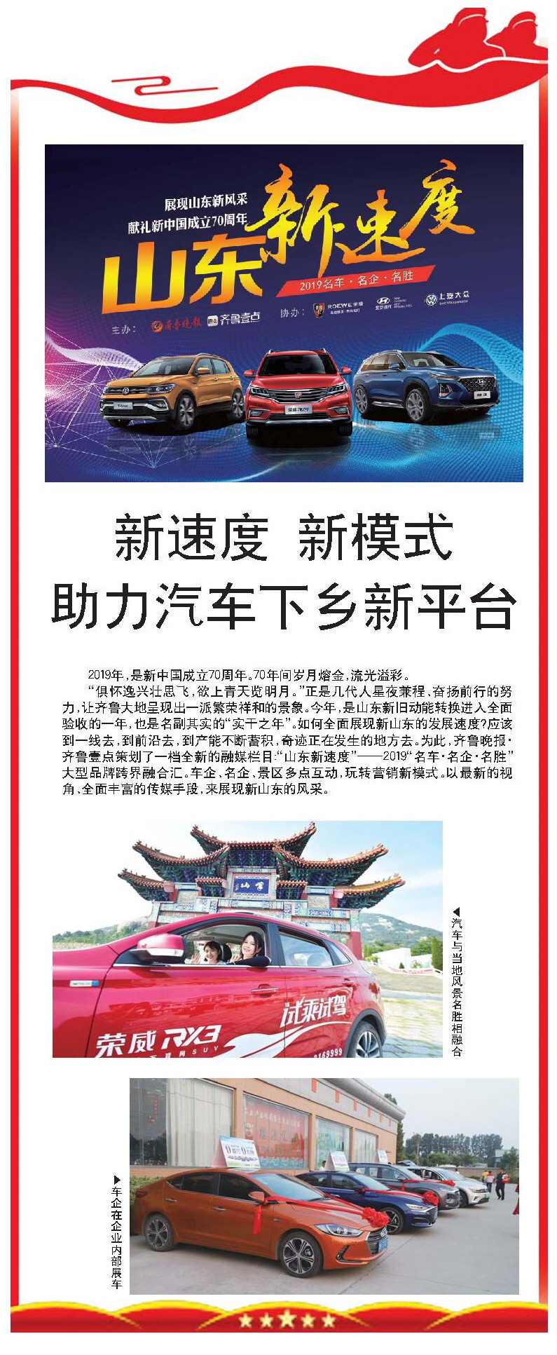 “俱怀逸兴壮思飞,欲上青天览明月。”正是几代人星夜兼程、奋扬前行的努力,让齐鲁大地呈现出一派繁荣祥和的景象。今年,是山东新旧动能转换进入全面验收的一年,也是名副其实的“实干之年”。如何全面展现新山东的发展速度?应该到一线去,到前沿去,到产能不断蓄积,奇迹正在发生的地方去。为此,齐鲁晚报·齐鲁壹点策划了一档全新的融媒栏目:“山东新速度”——2019“名车·名企·名胜”大型品牌跨界融合汇。车企、名企、景区多点互动,玩转营销新模式。以最新的视角、全面丰富的传媒手段,来展现新山东的风采。
