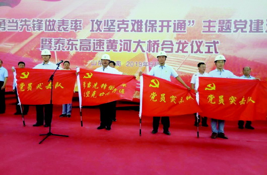 除了即将主线建成通车的泰东高速外,高速建设管理集团2019年要建成通车的还有高青至广饶、枣木东延两条高速公路,任务非常艰巨。为充分发挥基层党组织战斗堡垒和党员先锋模范作用,引领和保障项目如期建成,借泰东高速黄河大桥合龙这个机会,山东高速建设管理集团举办“勇当先锋做表率 攻坚克难保开通”主题党建活动,既是抓落实的“动员令”,又是抓攻坚的“冲锋号”。