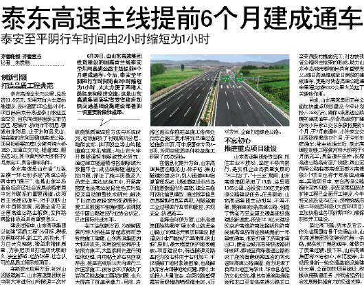 6月30日,由山东高速集团投资建设的国高青兰线泰安至东阿高速公路主线提前6个月建成通车。今后,泰安至平阴的行车时间将由2小时缩短为1小时,大大方便了两地人员往来和经济交流。这是山东高速集团落实省委省政府加快交通基础设施建设部署的一项重要阶段性成果。