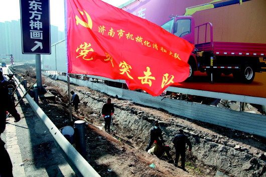 济南市机械化清扫大队党员突击队正在作业。 济南城管供图