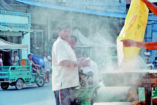 6月26日,在离家三公里远的大李海村,朱之文正在榨花生油,这也引来了众人围观。