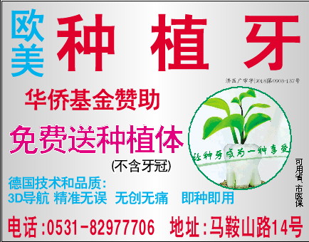种植牙 免费送种植体 电话:0531-82977706 地址:马鞍山路14号 德国技术和品质: 3D导航 精准无误 无创无痛 即种即用 华侨基金赞助 可用省、市医保 欧 美 济医广审字[2018]第0903-137号 (不含牙冠)
