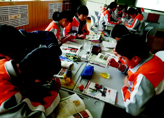 学生在生物课堂上做实验。