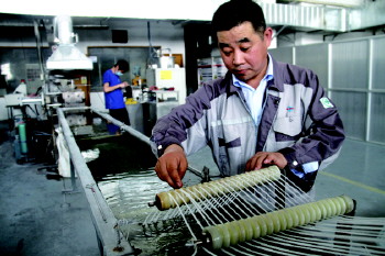 一次,机器上的温度感应器显示180℃,而正常工艺要求是120℃,他赶忙跑过去检查,用他戴胶皮手套的手,在机头上一试,果断说道:“温度感应器坏了。这温度正常,肯定是120℃。”他旁边的员工疑惑的看着他,只见他顺手把感应器的设置参数重新调整,感应器显示出正常的120℃——丰富的生产经验让他的手达到了这个环节上与精密仪器一样的功效。
