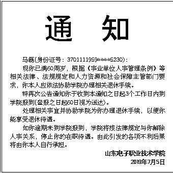 特再次公告通知你于收到本通知之日起3个工作日内到学院报到(登报之日起60日视为送达)。