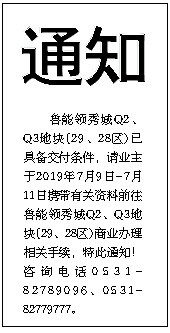 通知 鲁能领秀城Q2、Q3地块(29、28区)已具备交付条件,请业主于2019年7月9日-7月11日携带有关资料前往鲁能领秀城Q2、Q3地块(29、28区)商业办理相关手续,特此通知!咨询电话0531-82789096、0531-82779777。