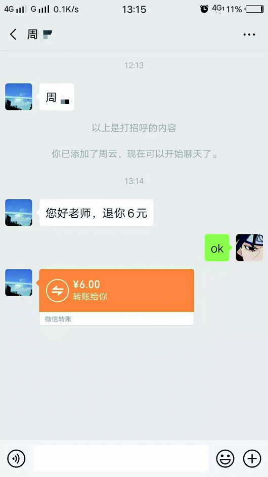 下午,停车管理人员退还了6元停车费。