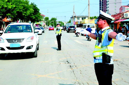 今年中高考期间,民警在考点外指挥交通。交警供图
