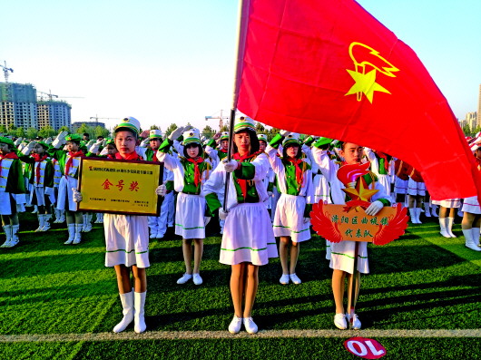 ◥曲堤镇中心小学在鼓号操比赛中获得金号奖。