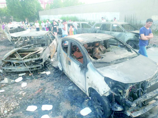 5日下午6点,记者在火灾现场看到,大火已经被扑灭,现场被烧毁的八辆汽车还停在原处,除了最北侧一辆面包车只是车尾部被烧,其余七辆汽车均已被烧得面目全非,外表一片漆黑,里面的座椅也都烧得只剩下框架,甚至有几辆车的油箱盖爆开,可能是燃烧过程中油箱发生爆炸。