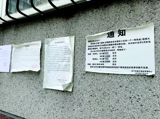 3日,记者来到历山路48-3号院。该小区共有南北两栋单元楼,其中北楼楼前张贴了3份由国网济南供电公司营业室向历下区城乡房地产开发公司告知的催交电费通知,张贴时间分别为2019年3月4日、2019年3月26日、2019年7月2日。