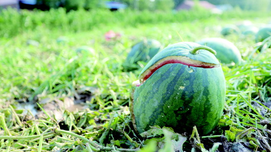 ▲冰雹过后,农田里的西瓜被砸裂。