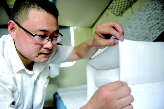 工作量最大的,莫过于车厢内床铺、被褥、座套等的整理了。18节车厢一共696张卧铺,车厢内的座椅更是数不清了。“最多的时候,我一天要叠140多床被子。”张明强熟练地整理着床铺,顾不得擦去脸上密密麻麻的汗珠。不到20秒,整整齐齐的“豆腐块”就在张明强手中叠好了。叠军被是看车人员的基本要求,整整齐齐方方正正的被褥会给乘客带来愉悦。让列车干干净净上路、乘客们开开心心抵达就是对他们工作的最大肯定。