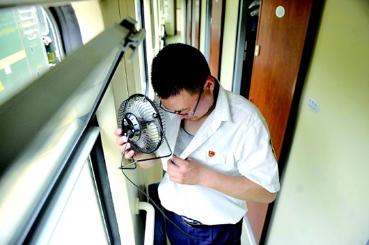 从早上8点半接车,一直到晚上8点交给出务班组乘务人员,看车人员要在无电无风的车厢内“蒸”近12个小时,衣服很少有干的时候。小风扇、西瓜、藿香正气水、绿豆汤等等是常备。列车处于停车状态,车厢内厕所无法使用,所以他们有时候连水都不敢多喝,“上个厕所来回要半个小时,太浪费时间啦!”张明强笑着说。