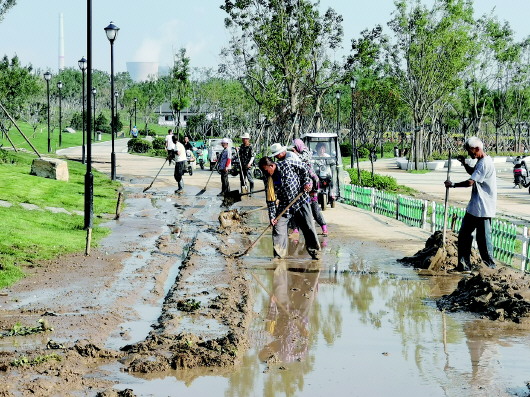 根据市民的指引,记者随后来到华山湖东侧华山东路与华泉路交叉口北侧看到,该路段路面上确实有很多泥浆,十多名工人正在清理淤泥,路边已堆积起几座泥堆,一辆翻斗车不断将工人清理的淤泥运出去。