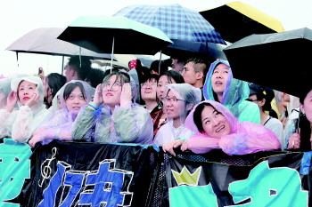 激情的歌迷冒雨狂欢。