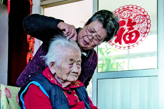 焦秀芝给老母亲理发。