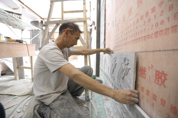 张贴汉画像石风格瓷砖。