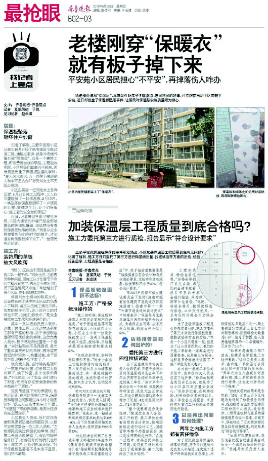针对这次保温板掉落,9日下午,历下区住建局领导和业主代表见面,针对业主对施工项目是否存在安全隐患的问题,进行专题座谈,约定在10日召集施工、监理、设计等单位进行研究,业主选定第三方进行检测。如果检测不合格,追究施工和监理的责任的同时,进行彻底整改,让业主放心、满意。