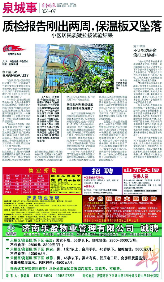 近日,本报两次报道了济南三箭平安苑小区保温板坠落的事件。短短三个月内,小区里就有多块保温板陆续坠落。然而,就在最近一块保温板坠落前的半个月,该项工程的四份拉拔实验报告刚刚出炉,报告显示“符合设计标准”。