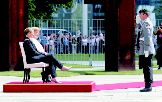 ◤7月11日,在德国柏林,德国总理默克尔(左二)与到访的丹麦新任首相梅特·弗雷泽里克森(左一)一同出席欢迎仪式。 新华/法新