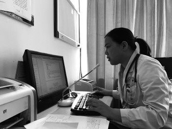 医务人员运用语音智能识别系统录入病历。