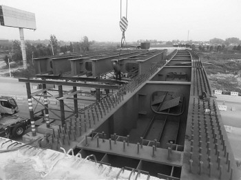 钢箱梁架设现场。