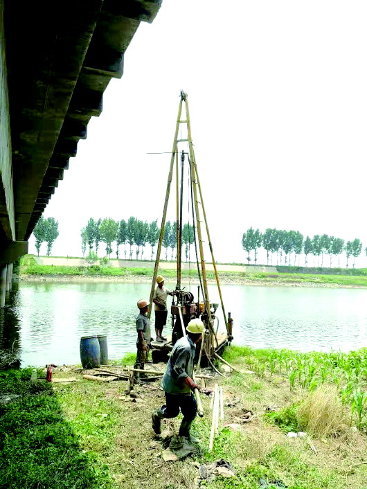 ◥小清河东营河段,工作人员在河边提取土壤样本。