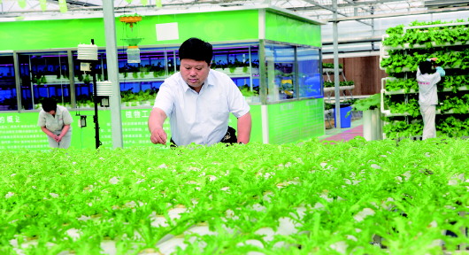 王传喜在兰陵国家农业公园的温室内查看无土栽培植物的长势情况。(资料片)