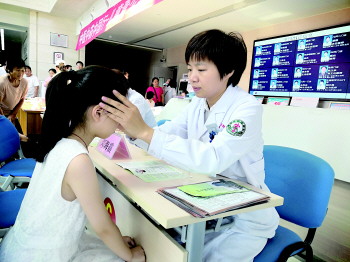 家住菏泽市牡丹区和平小区的张女士,在前几天就听说今天有小儿近视推拿的专家在门诊大厅义诊。这不,早上8时多,就带着9岁半的女儿到医院了。“去年带女儿来医院查过,当时查的双眼是1.0、1.5,当时也没佩戴眼镜,回来也很少注意,现在孩子视物比较模糊,就想着找专家看看。”张女士说。“这个孩子目前属于假性近视,而且年龄比较小,如果做这种小儿近视推拿效果是很好的,一次大概做20几分钟。”市中医医院针灸推拿科主任邓海霞说。