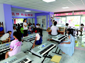 本报荣成7月15日讯(吕冰) “哆瑞咪发嗖拉西多”,跳跃的琴键弹奏出一串串优美的音符,得润社区的青少年活动室内,孩子们在轻松优雅的环境中快乐地弹奏演唱,一段段美妙的乐曲在孩子们的演绎中怒放出它迷人的韵律。