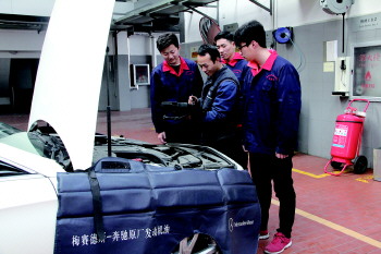 汽车检测与维修专业学生在奔驰4S店学习实训。