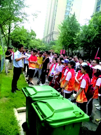 7月16日上午,日照一中和日照实验高中的孩子们以及部分家长和老师兴致勃勃地来到了天宁首府小区,观摩城市生活垃圾“定时定点”分类投放,亲身体验环卫志愿服务,实地了解环卫工作流程。