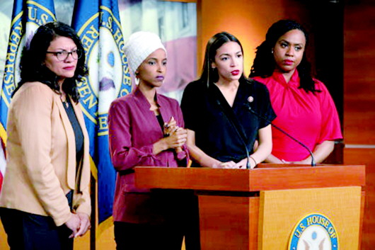 15日,被特朗普批评的4名少数族裔女议员出席新闻发布会。