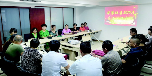 华黎花园小区的居民会议上,社区居委会、小区业委会、物业、单元楼长就小区内事务进行商议。