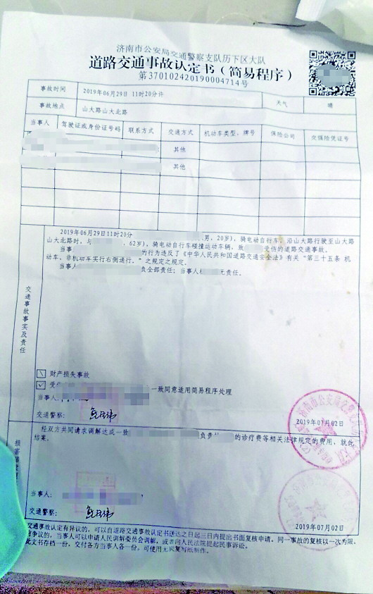 霍先生称,7月2日,外卖小哥找到交警部门,要求将私了协议书改成交通事故认定书。在这份认定书上,事故发生在6月29日晚11点20分,外卖小哥因违反“机动车、非机动车实行右侧通行”的法律规定而负全部责任,杜女士无责任。