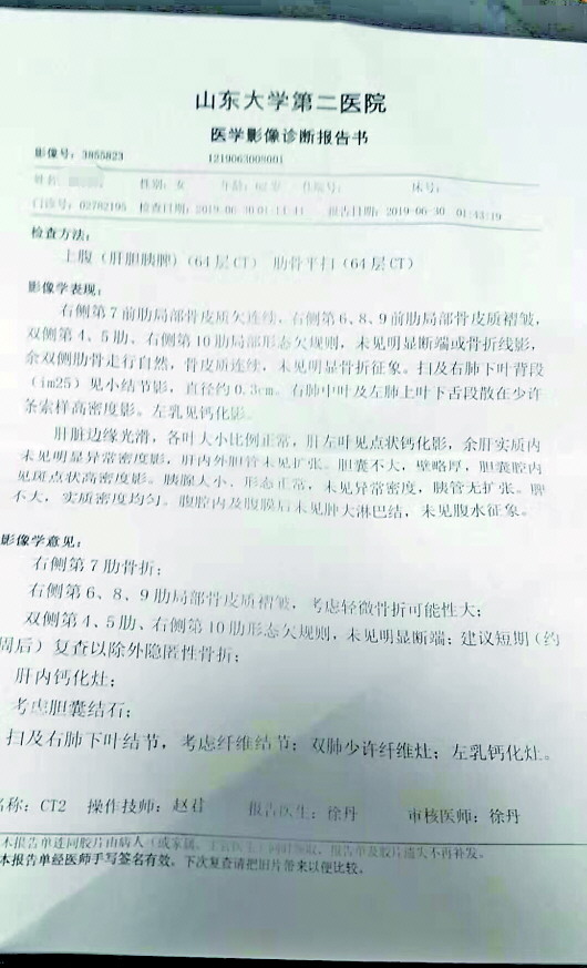 交警处理结束后,外卖小哥陪着杜女士到山大二院做了检查。CT结果显示,杜女士右侧第7根肋骨骨折,右侧第6、8、9肋骨局部骨皮质褶皱,轻微骨折可能性大。