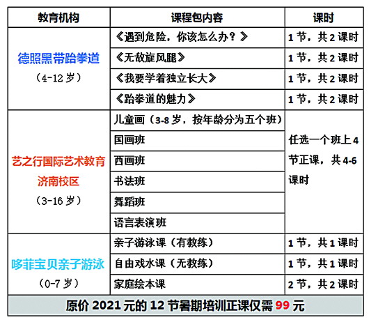 7月16日,首期“暑期聚惠课99元课程包”已在齐鲁壹点上线,涵盖了德照黑带跆拳道、艺之行国际艺术教育济南校区以及哆菲宝贝亲子游泳俱乐部三家机构提供的特惠课程。课程包共包括上述三家机构各四节正课,共12节,课程总价2021元,家长们现在在“壹点活动助手”小程序上购买仅需99元。报名成功后,将有机构工作人员致电对接约课事宜,后期按照课程时间到机构出示报名信息即可使用。课程包名额有限,家长可扫描文末小程序码了解课程详情并在线抢课。