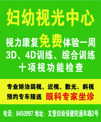 随着国家对青少年儿童眼健康的高度重视及眼保健工作开展的需要,文登妇幼保健院率先在烟威地区成立了由三甲医院斜视弱视及小儿眼科专家为核心团队的眼视光中心,引进了全自动综合验光仪、日本尼德克电脑验光仪、裂隙灯、眼底镜、四孔灯、立体视检查本、三棱镜等一系列专业检查设备及3D多媒体综合训练、4D多媒体弱视训练、离子导入、同视机、八通道、舒目镜、增视仪、中药灸疗等先进的矫治训练项目。希望能够帮助更多的孩子解决视力问题。