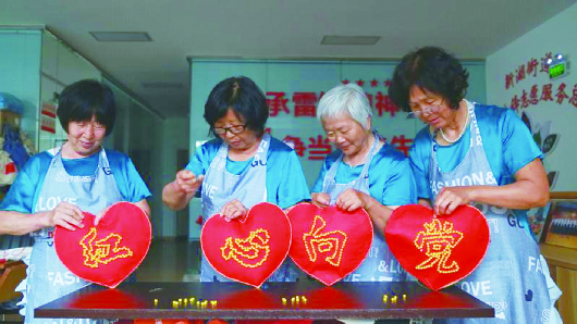 乐缝创意坊党员志愿者手工缝制庆“七一”工艺品。