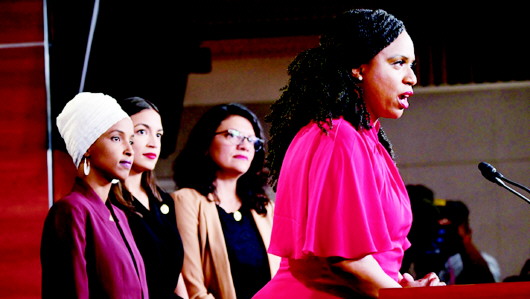 被特朗普攻击的四名少数族裔女议员出席新闻发布会,左一为奥马尔。