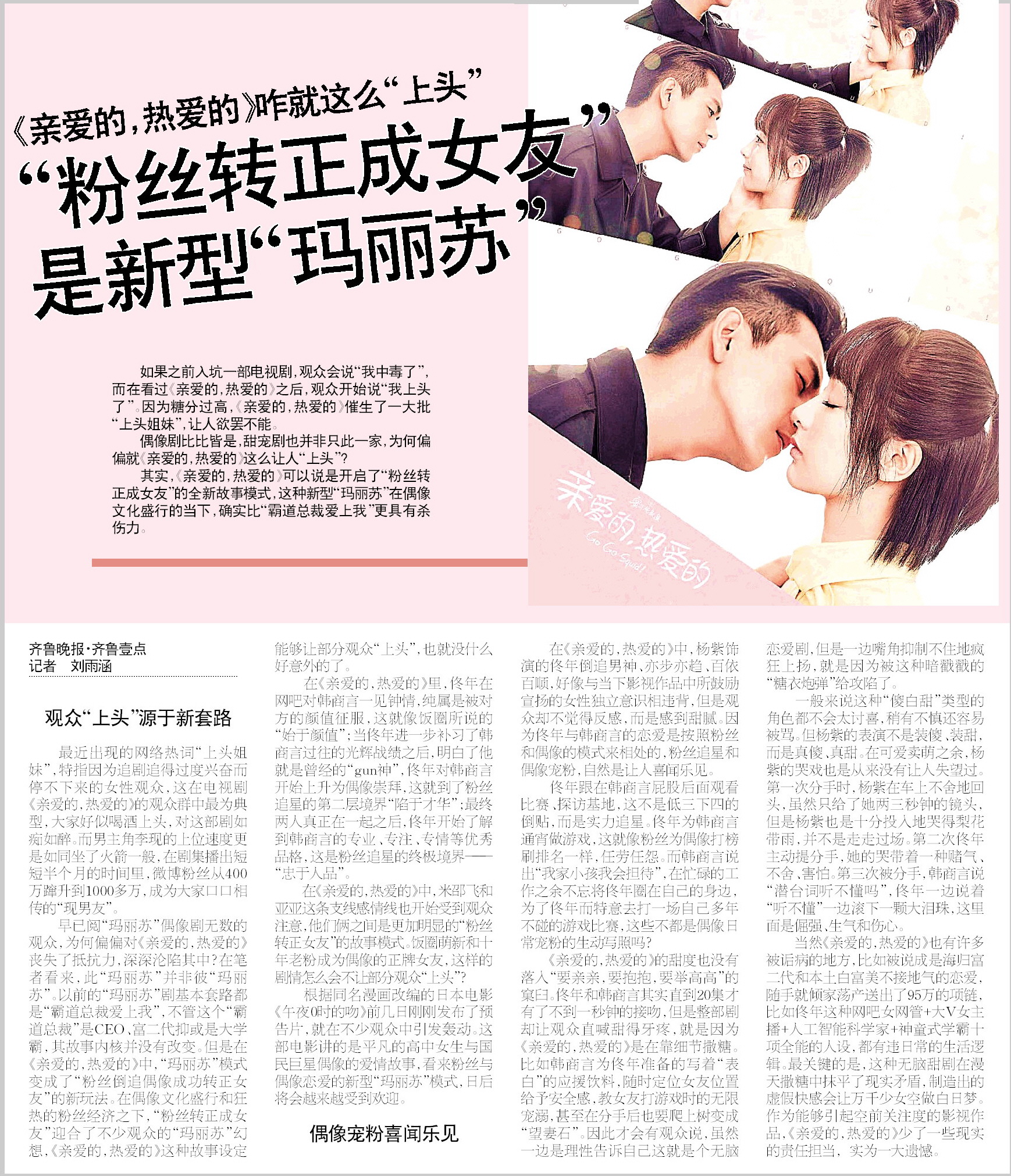 其实,《亲爱的,热爱的》可以说是开启了“粉丝转正成女友”的全新故事模式,这种新型“玛丽苏”在偶像文化盛行的当下,确实比“霸道总裁爱上我”更具有杀伤力。