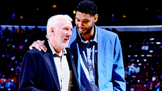 当邓肯和波波维奇一同坐在场边的教练席上,仿佛时光又被拉回到几年前。彼时,邓肯还是联盟里最强大的前锋,波波维奇则是联盟里最老辣的教练,他们曾经在19年里赢下了1392场比赛,成为NBA历史上赢球场次最多的“球员和教练”二人组。