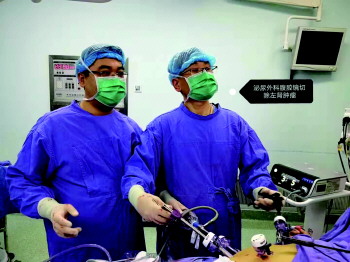 根据上述可能出现的情况,日照市人民医院普通外科三(胃肠)病区请示汇报医务科后并积极进行了协调,术前组织了多学科综合会诊讨论,专家们一致认为克服困难,采取腹腔镜微创手术,不仅可以使手术更精准、更精细、解剖更彻底,减少出血量,缩短住院时间,同时可以有效避免传统术式可能需要在腹部留下两个10余厘米长疤痕的弊端,因此决定行腹腔镜下全胃切除+左肾部分切除+区域淋巴结清扫手术。