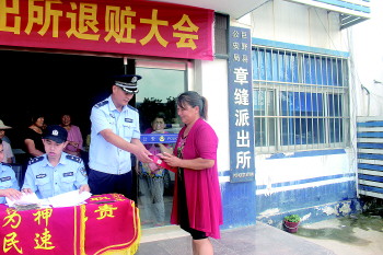 近日,巨野县公安局章缝派出所举行退赃发还大会,30余名受害群众领到被诈骗的财物后,感激之情溢于言表,并向章缝派出所送上锦旗表示感谢。据悉,为震慑违法犯罪分子的嚣张气焰,保护人民群众的财产安全,巨野县公安局章缝派出所举行了此次退赃发还大会。 本报记者 李德领 摄影报道