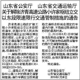 四、济青高速公路小许家枢纽立交以西段仍采取限速限行交通管制措施。确定解除时间后,由相关管理单位另行发布。