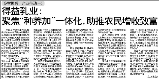作为农业产业化国家重点龙头企业,得益乳业积极响应国家乡村振兴战略号召,主动落实乡村振兴战略决策部署,在高青县北纬37度的黄河三角洲湿地,投资建设一二三产业融合、种养加生态循环奶业基地,依照国际最高标准,从澳大利亚进口了7000头纯种澳洲荷斯坦奶牛,采用世界最先进的牧场设备,融合智能化、信息化技术,投资建设3个现代化的万头牧场,奶牛存栏量达到3.5万头,配套建设2万亩美国紫花苜蓿和玉米青贮种植基地,打造以种、养、加结合为特色,以自然、环保、绿色、健康为宗旨的特色生态循环农业,助力打造乡村振兴齐鲁样板,此项目已被列为山东省重点建设项目。